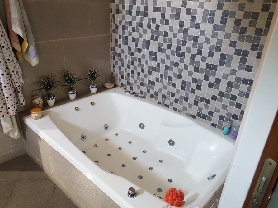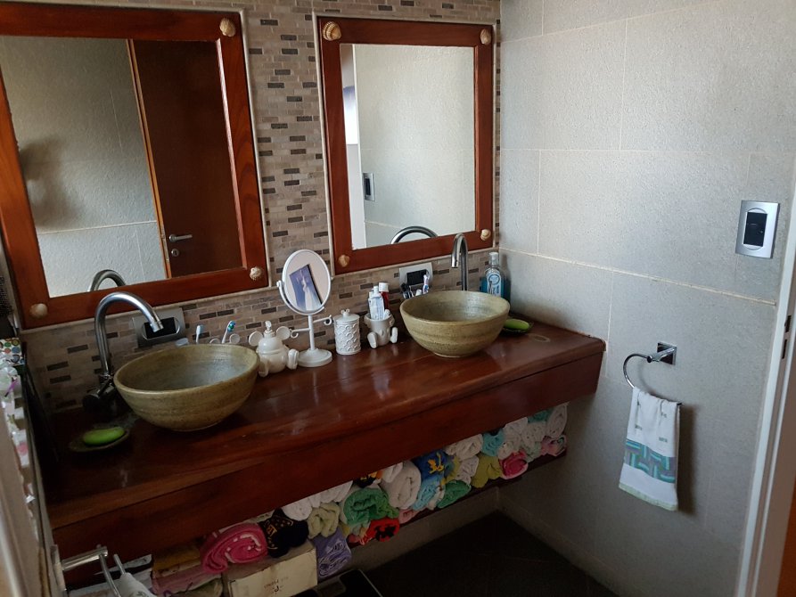 Baño en suite compartimentado, con bañera hidromasaje, ducha, mesada con doble bacha.